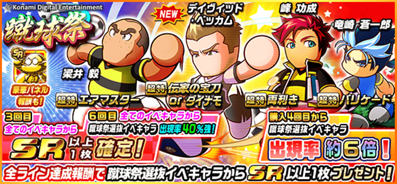 ベッカムや「峰 功成」「竜崎 蒼一郎」「梁井 毅」といった人気イベキャラが登場する「蹴球祭ガチャ」は、2018年2月7日(水)13:59まで。