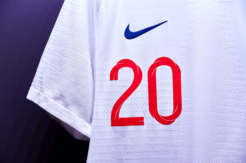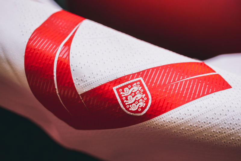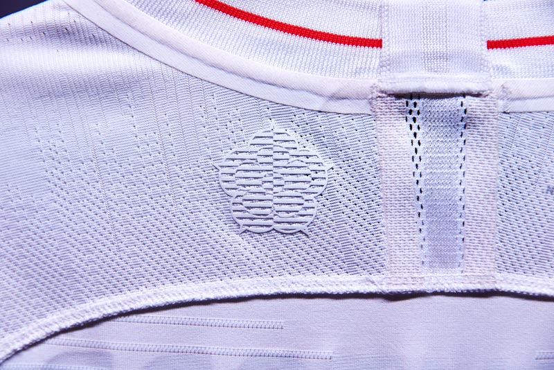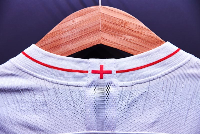 首元にはおなじみのイングランド国旗「セント・ジョージ・クロス」を配している。形状が目を引く生地の「織り」は、このユニフォームのテンプレートともいえるNike“ヴェイパーニット”の特徴。