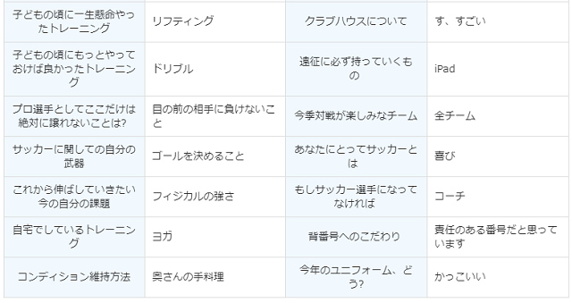 「サッカーに関しての自分の武器」や「サッカーを始めたきっかけ」といった定番の内容から、「サインの理由・内容」などの人となりが窺えるもの、さらには「最初に買ったCD」や「お気に入りのLINEスタンプ」など質問内容は多岐にわたり、その質問数は全部で206!