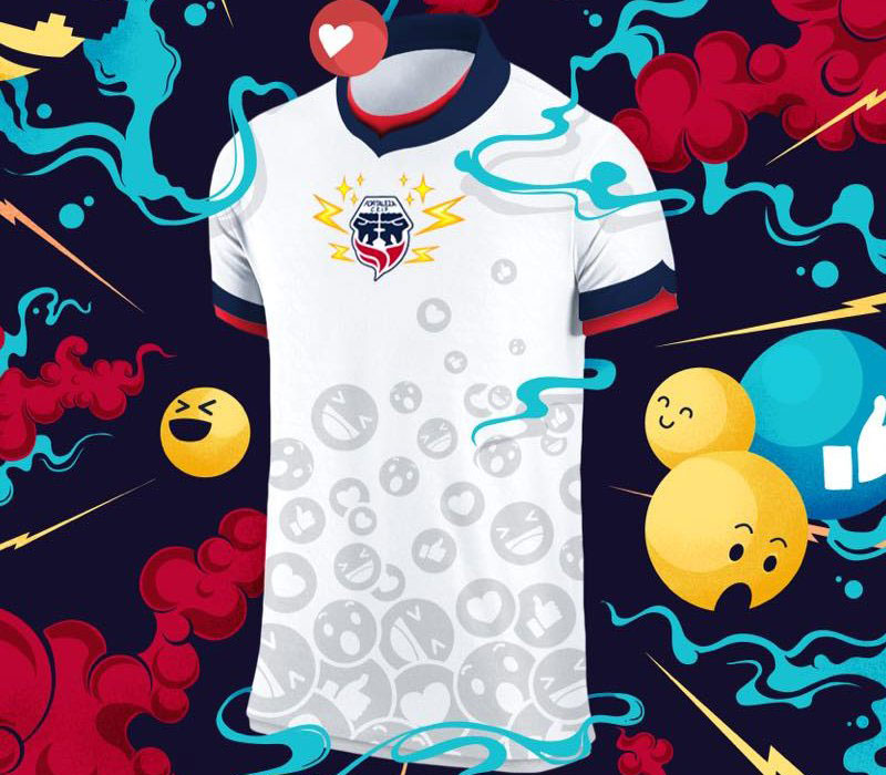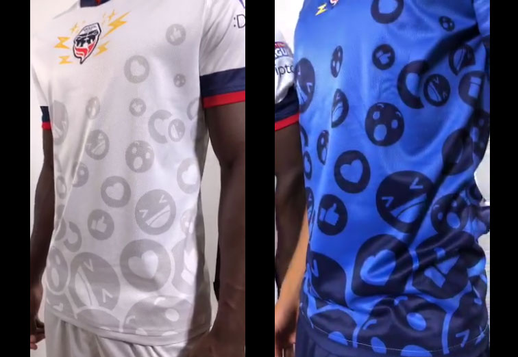 ホワイトがホームキットで、ブルーはアウェイキット。どちらも同じデザインの色違いで、同じようにアイコンをプリント。もちろんエンブレム横の雷も絵文字で、公式のエンブレムに雷マークは付かない。