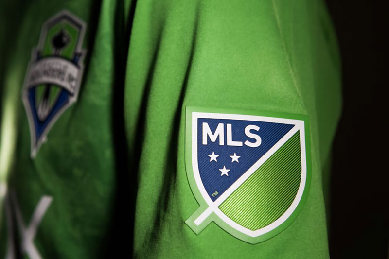 チームごとに色が異なるMLSバッジ。シアトルはチームカラーのグリーン/ブルーで彩っている。