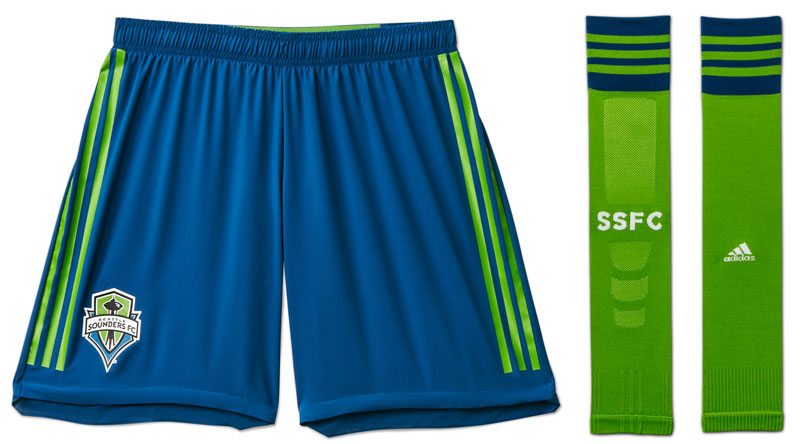 パンツはブルーを基調にグリーンのスリーストライプス。ソックスはグリーンを基調に、前面にはadidasロゴ、背面にチーム名の略称“SSFC”のグラフィックが入る。