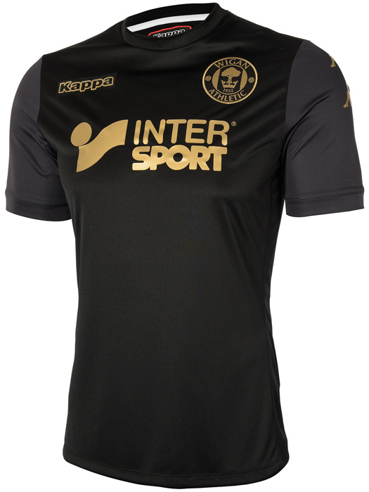 ブラックを基調としたアウェイキットもウィガンでは定番。スポンサーロゴやエンブレムなどをゴールドで統一していて、なかなか格好良い。背面のデザインはホームキットと同じ。