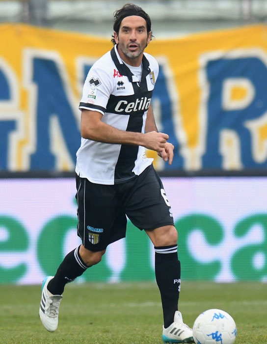 パンツとソックスはブラックを基調。パンツはチェンジ用でホワイトも用意されている。写真は主将アレッサンドロ・ルカレッリ。彼の存在なくしてパルマ復活は有り得なかった。