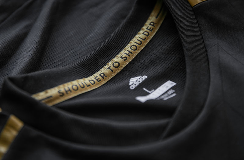 ホームキット第1号はブラックを基調に、肩のスリーストライプスやメーカーロゴをゴールドで彩っている。シャツ全体に幾何学模様をあしらった。