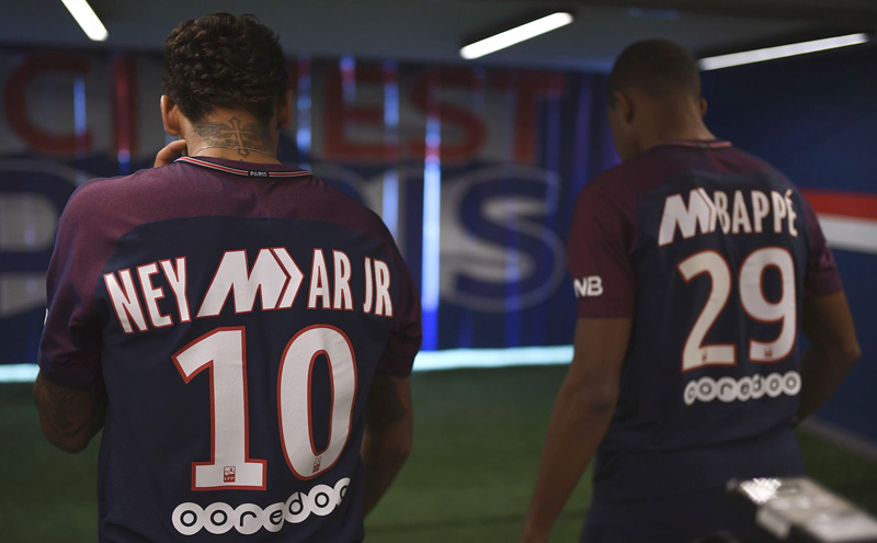 限定版ユニフォームを着たネイマールとエンバペのバックショット。ネームの「M」は通常とは異なり、マーキュリアルのMロゴを使用している。