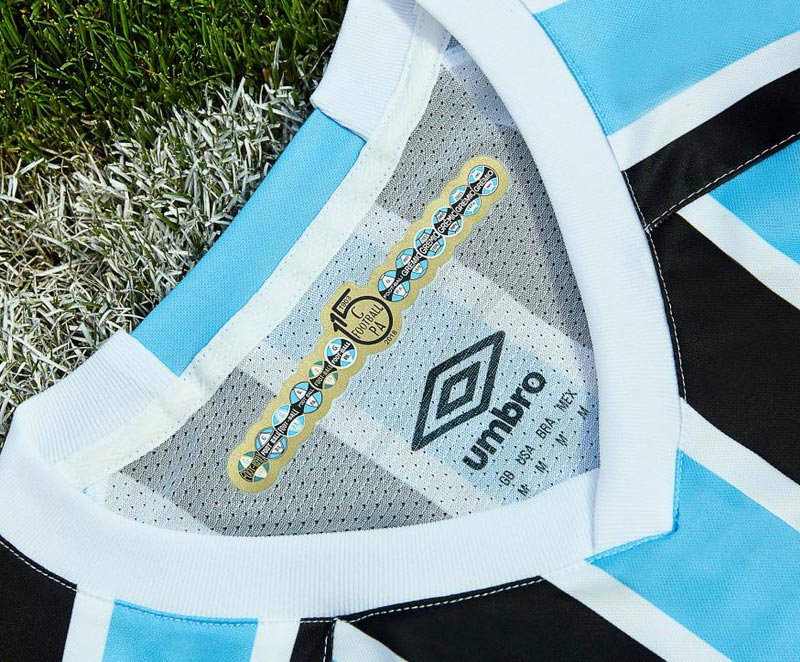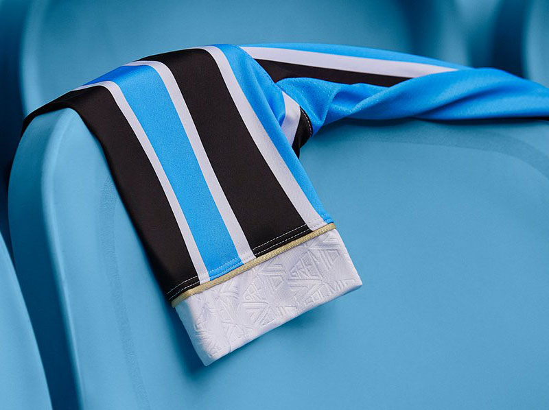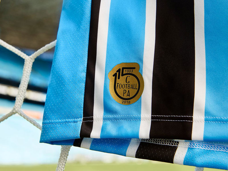 右裾にもゴールドの115周年記念ロゴをプリントしている。上に“G”(グレミオ)、中央に“FOOTBALL”、下に“PA”(ポルトアレグレ)と並べるスタイルは、1960年代まで使われたエンブレムのデザインと同じだ。