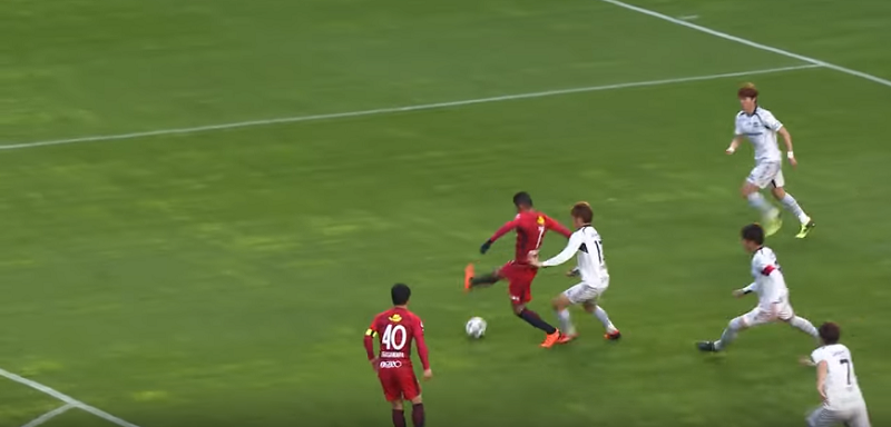 すると右足のヒールを使って前方にコントロールすると、一瞬の加速でボールに追いつきフリーの状態でシュート!