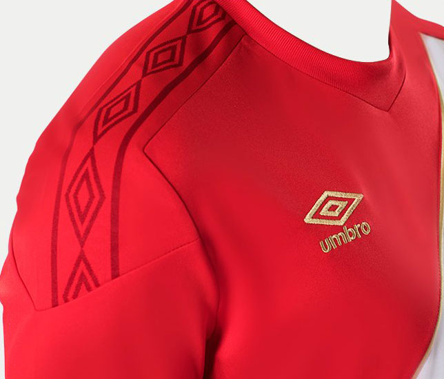 肩にはUmbro“ダブルダイヤモンド”をプリント。胸のメーカーロゴマークはゴールドの刺繍であしらっている。前述の通り2018年夏からはMarathonのキットを使用するため、W杯を最後にUmbroとはいったんお別れになる。