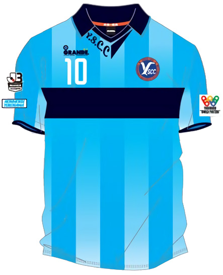 ライトブルーとホワイトのストライプが爽やかな今季のデザイン。右側の首元にはクラブ名“Y.S.C.C.”をプリントした。胸スポンサーは現時点で空いたままとなっている。