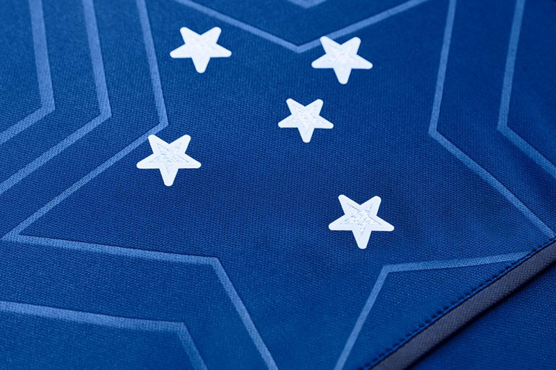 伝統のブルーを基調としたホームキット。クルゼイロと言えば南十字星のエンブレムが特徴だが、このユニフォームはその南十字星を、星の形のエンボスプリントで囲むようにデザイン。かなり“星づくし”のデザインとなっている。