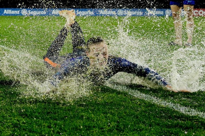 優勝が決まると、ぬかるんだピッチでダイブ!