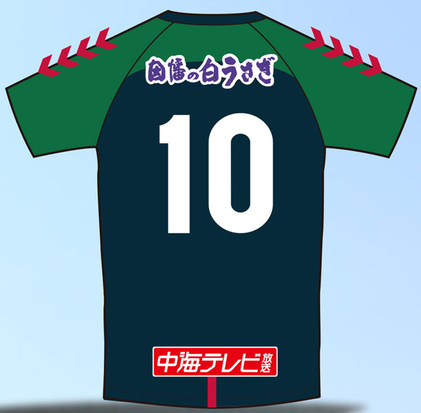 背面は肩部分を境に濃淡異なるグリーンでカラーチェンジ。背中スポンサーは「因幡の白うさぎ」で継続し、腰スポンサーは新たに「中海テレビ放送」が入る。