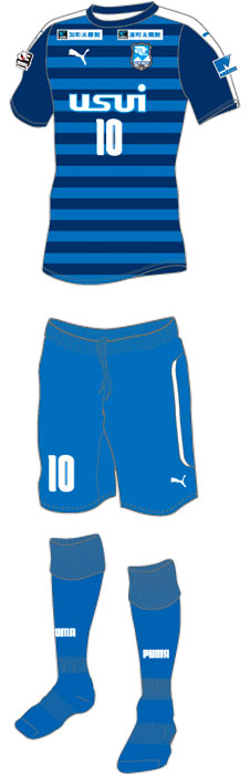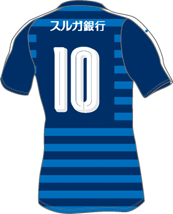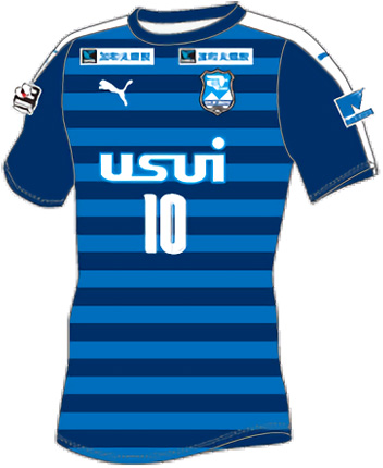 クラブ伝統のブルーにネイビーを組み合せて力強いボーダー柄(水平ストライプ)に仕上げた。胸スポンサーは「USUI」で継続。鎖骨スポンサーは左右どちらも「加和太建設」をプリントしている。