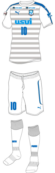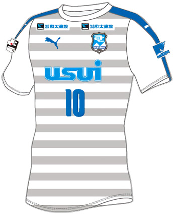 基本的なデザインはホームと同じで、アウェイはホワイト/グレーのボーダー柄。右袖にはリーグバッジをプリント。左袖のスポンサーは「MEIDEN」で継続している。