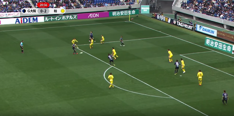 0-2とリードされ迎えた21分、G大阪は左サイドから藤春廣輝が中央へと折り返すと、これを遠藤保仁がダイレクトパス!