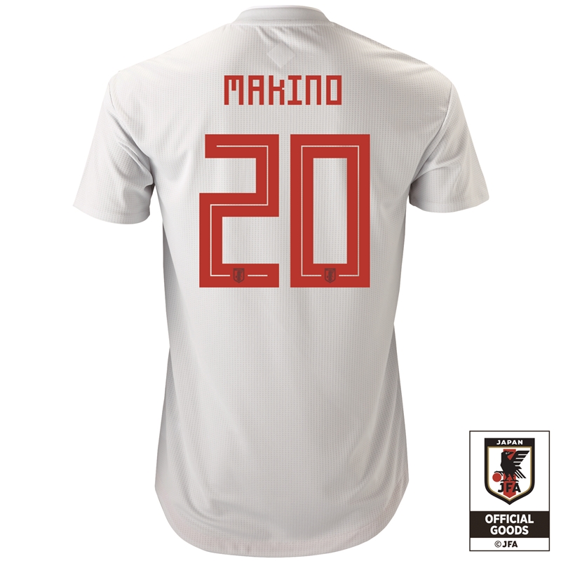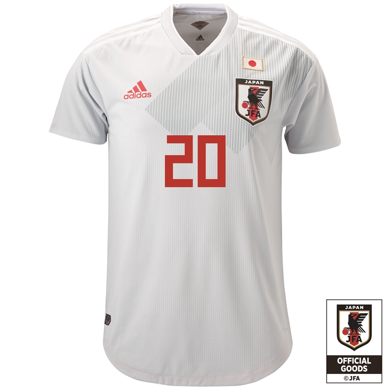 ナンバーやロゴには赤色を採用。サッカー日本代表アウェイユニフォームとしては初めて青色を一切使わない白と赤のみの配色にすることにより、日の丸のカラーを近未来的に表現している。