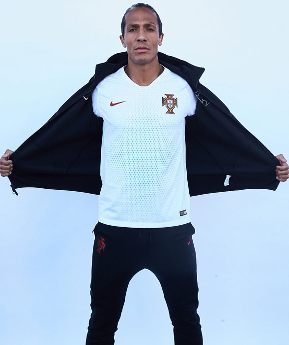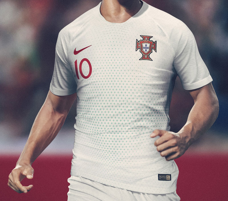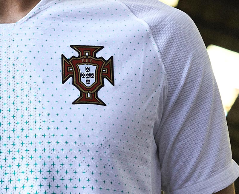 グリーンの小さな十字模様を除いては、襟周りや袖口などに他の色を使わずホワイト一色というのは、ポルトガル代表では珍しい。右胸のスウッシュ(Nikeロゴ)と胸番号はレッドで彩っている。