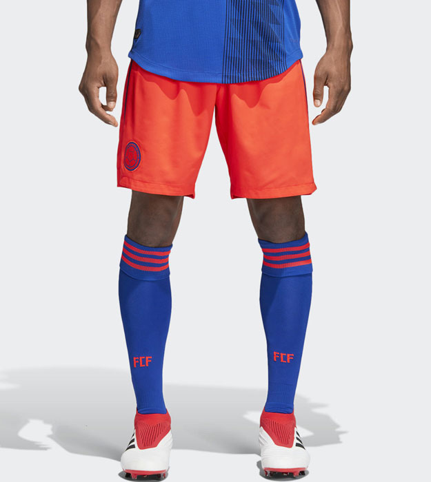 パンツはソーラーレッドが基調。ソックスはブルーを基調にソーラーレッドの差し色を配し、前面にはFCF(コロンビアサッカー連盟)のグラフィックが入る。