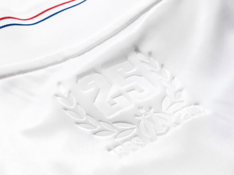 背面の首元にはCL優勝25周年を記念したロゴをエンボスプリント。このユニフォームが25周年記念だと一目で分かるそれは、今回の復刻版で一番のポイントかもしれない。