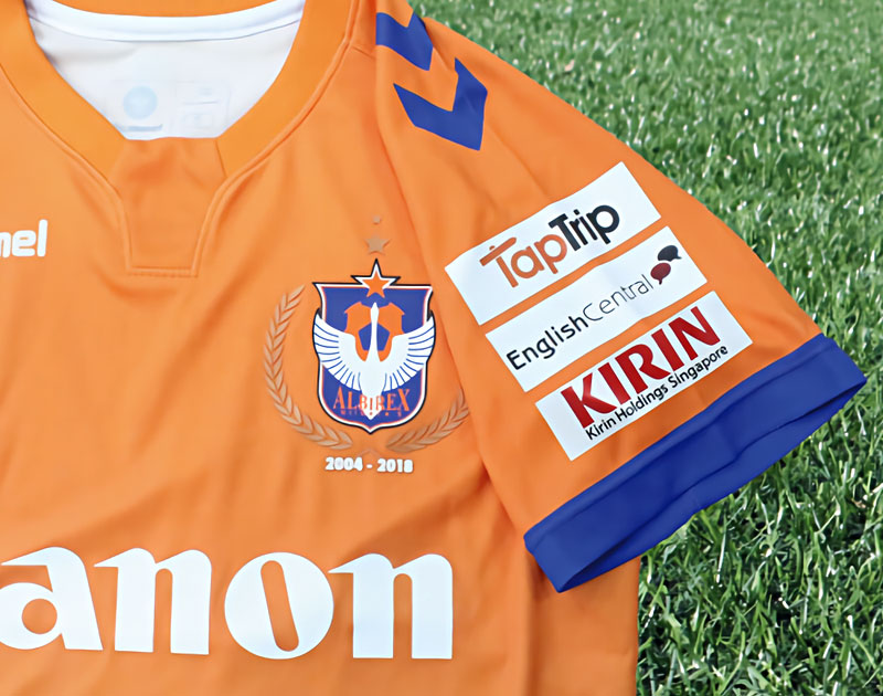 エンブレムは月桂樹で飾った15周年記念仕様。左袖には三つのスポンサー「Tap Trip」「English Central」「KIRIN」が入る。なお画像は無いが、右袖にはリーグバッジをプリントする。