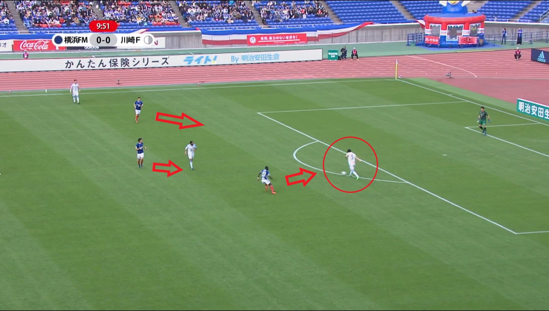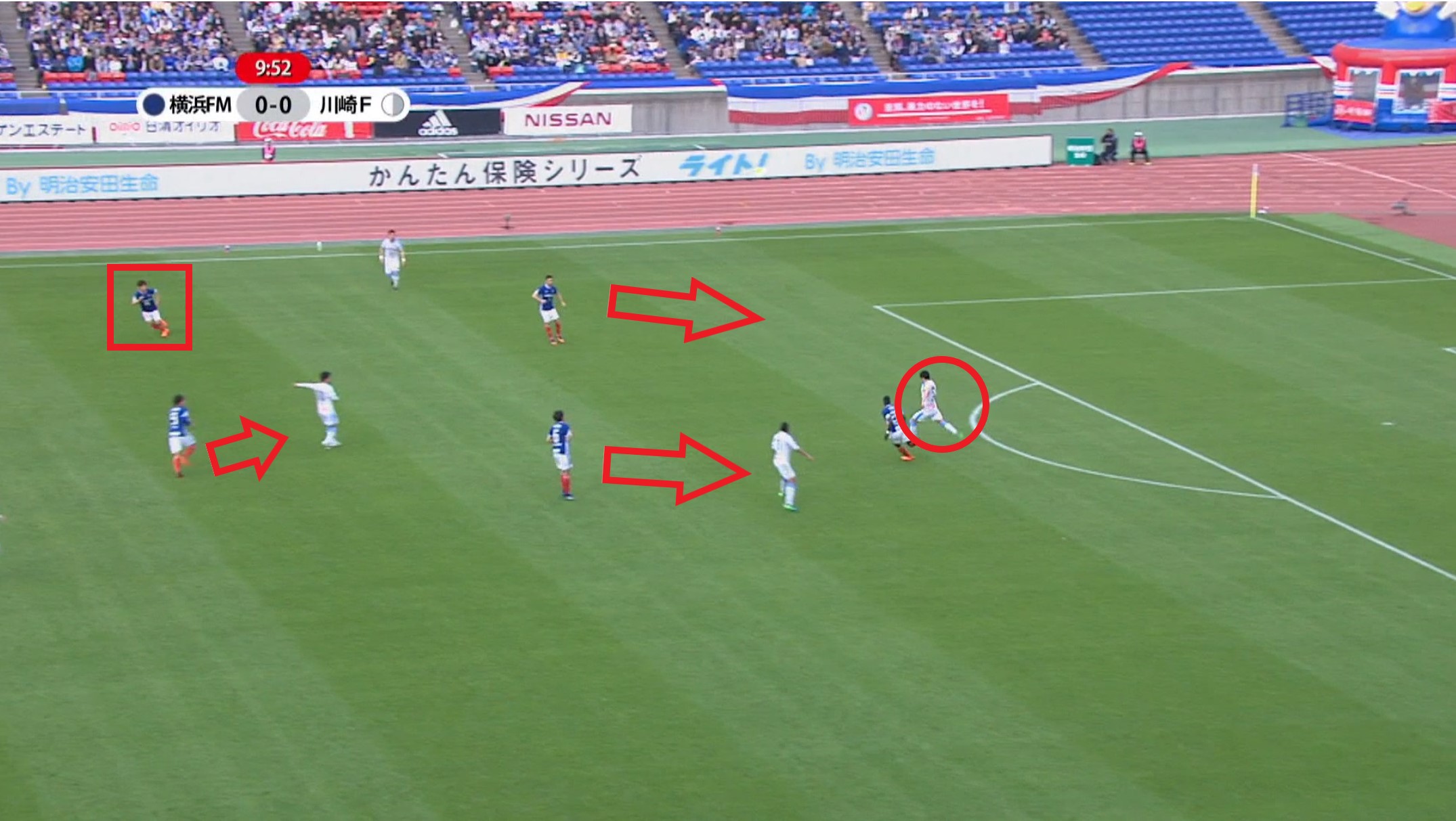逆にそこが破綻すれば、一気にピンチに陥ることになるのだが、フロンターレ戦におけるマリノスはそのサンプルになりそうなシーンがいくつも見られた。