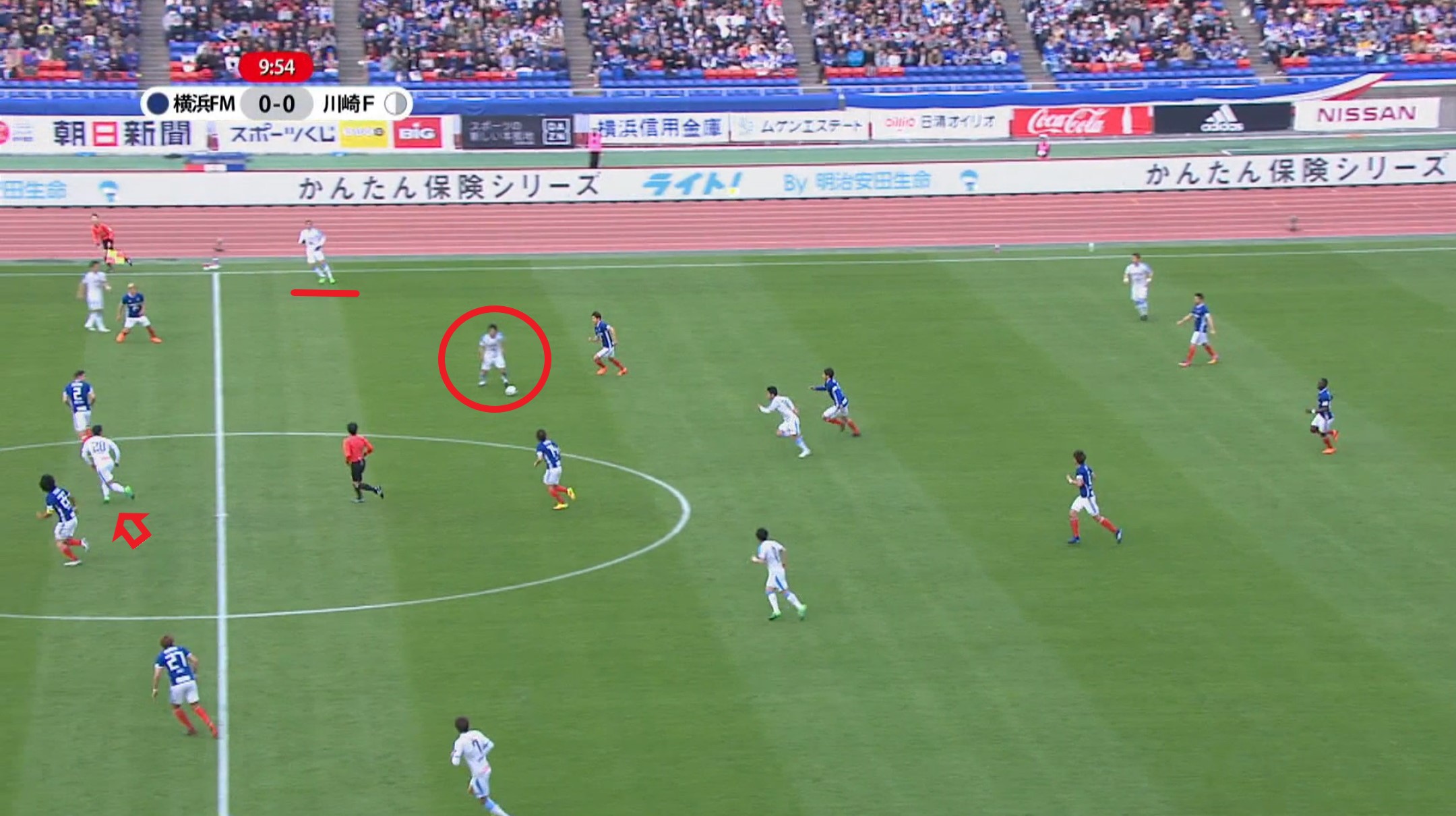 これは上述のポジショニングミスを利用して、谷口の縦パスが攻撃のキーマン中村に収まった瞬間であるが、まさに「完全フリー」であることがわかるだろう。