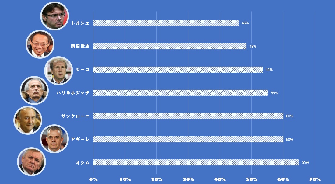 岡田武史監督は第一次政権と第二次政権を足したデータであるが、合計64試合で31勝16分17敗の48%、二回目だけに限定しても50%程度しかない。