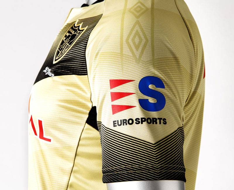 肩から袖にかけて並ぶUmbroのダブル・ダイヤモンドもゴールドで彩っている。袖のブラックのストライプがほど良いアクセントに。