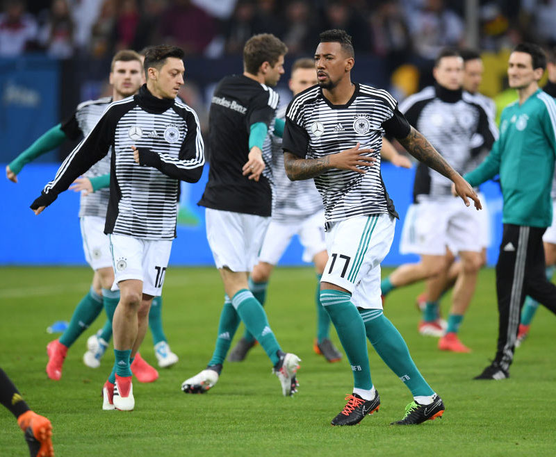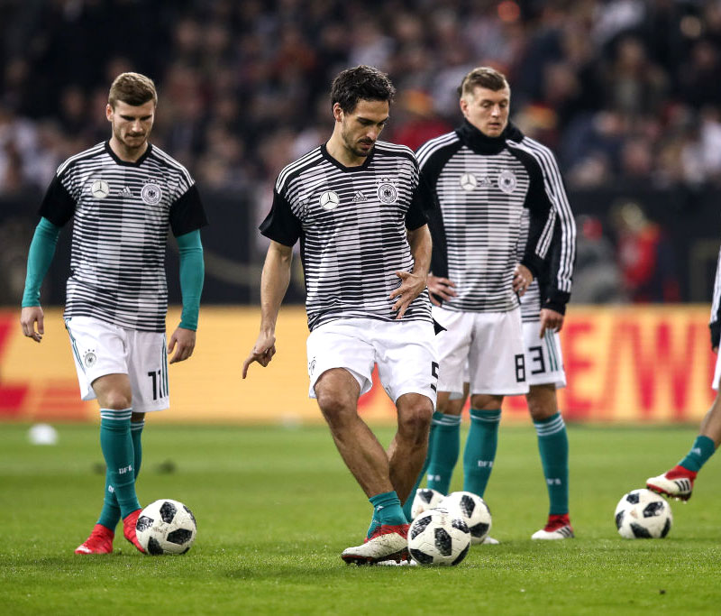 これは3月のインターナショナルマッチ・ウィークでのドイツ代表の試合前の様子。まだ寒い時期だったので、選手によっては長袖(プレマッチ・ウォームトップ)を着ているが、このような感じで使われる。