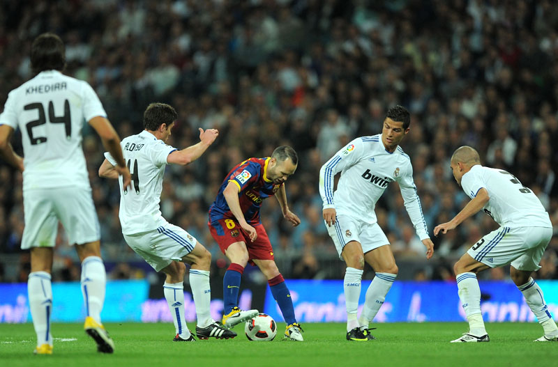 対戦相手にとって常に脅威だったイニエスタの存在。それは“ライバル”レアル・マドリーにとっても同じだろう。この写真は2010-11シーズン(第32節)でのクラシコの一場面だが、これを見るだけでもイニエスタへの警戒ぶりがうかがえる。