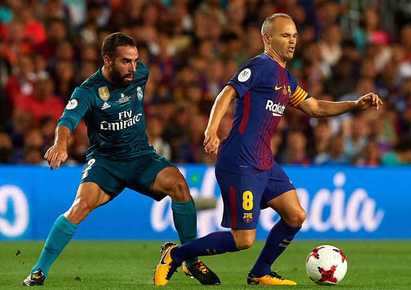 ラ・リーガのシーズン開幕前に行われたスーペルコパはホーム、アウェイとも敗れている。マッチアップするレアルのカルバハルが着ているのは、グリーンのアウェイユニフォーム。クラシコでは珍しくホーム以外を使用した。