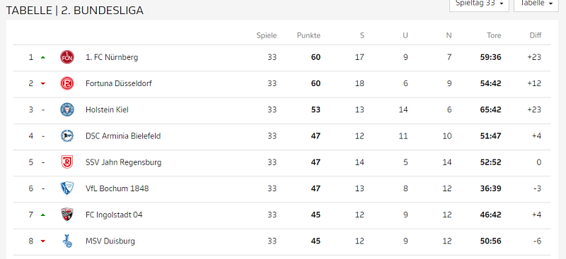 しかし、ブンデスリーガ2部のレギュレーションでは勝点、得失点差、総得点という順番で順位を決めるため、得失点差で優位な状況にあるニュルンベルクが最終節を前に首位に浮上した形だ。