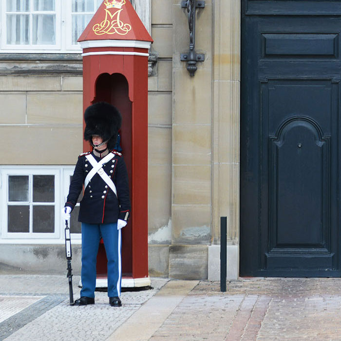 アマリエンボー宮殿の警護にあたる近衛兵。今回のユニフォームにデザインされている「クロス」を確認できる。また差し色のブルーも、制服の色に由来していることが分かる。