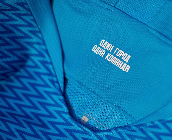 首元内側のロシア語“ОДИН ГОРОД ОДНА КОМАНДА”は、直訳すると「一つの街、一つのチーム」。これは“ゼニトはサンクトペテルブルクで唯一のチーム”という意味を込めたサポーター・チャントの歌詞。