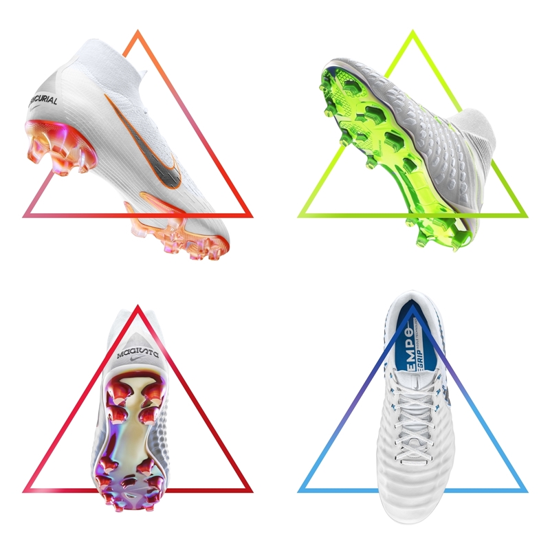 4サイロすべてに採用された白のアッパーには、つやを消したパールのようなスキンをかぶせ、メタリッククールグレイのロゴで装飾。各国の代表チームのカラーが引き立つようデザインされている。