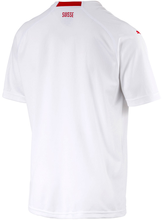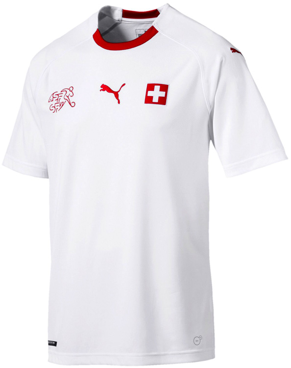 アウェイキットはホワイトを基調にレッドの差し色と、スイス代表らしいカラーコンビネーション。2010年モデル以降は基本的に協会エンブレムを右胸、スイス国旗を左胸に配するスタイルが定着している。
