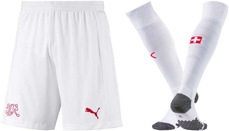 パンツ、ソックスともにホワイトを基調。ソックスは前面にPumaキャットロゴ、背面にスイス国旗のグラフィックが入る。