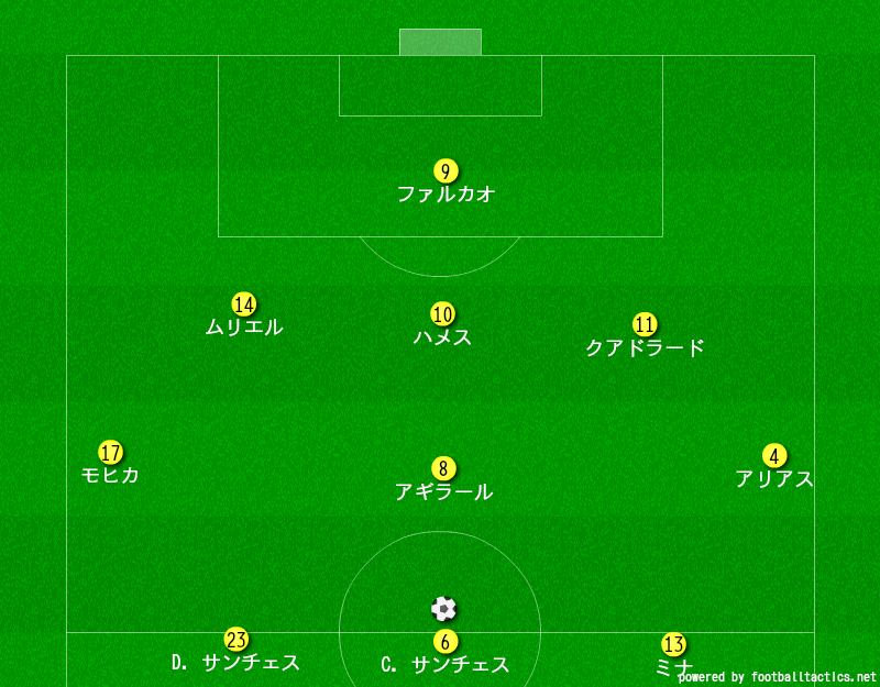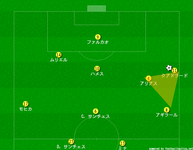 サイドバックが高い位置を取ると同時にハメスとクアドラードの両翼は中寄りにポジションを取る。つまり、両サイドバックがオーバーラップするためのスペースを作る形ですね。