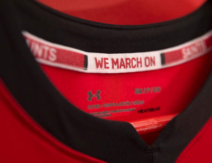 内側の首元部分のネックテープには、クラブのスローガン“WE MARCH ON(我々は前進する)”をプリント。