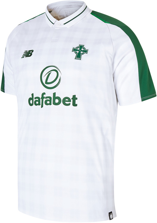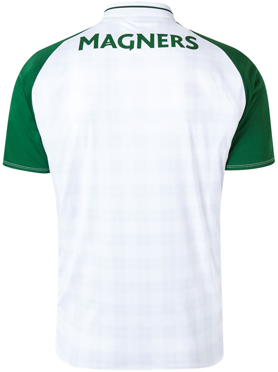 ホームキットと同じように、シャツ全体に透かしのタータンチェックをあしらったデザイン。首周りは小さめの襟付きで、胸元はシングルボタン止めとなっている。肩から袖にかけてのグリーンのラインも、セルティックらしくて良い感じだ。