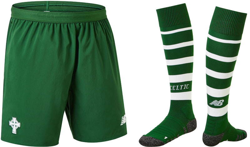 パンツはグリーンを基調。ソックスはホワイトとグリーンのストライプ(セルティックの場合、正確には「輪」を意味する“フープ”と表現)。足首に近い部分にチーム名とメーカーロゴが入る。