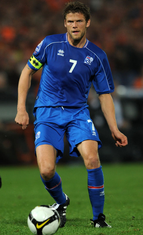 アウェイキットは白を基調に青の差し色。画像は2010年3月に行われたメキシコ代表とのフレンドリーマッチで、7番はロシアW杯メンバーでもあるヨウハン・グズムンドソン。