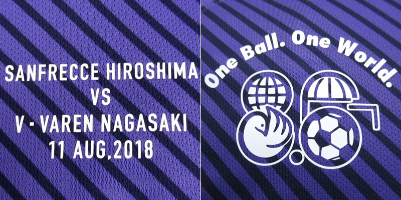 胸の2か所に、このユニフォームの特徴的なプリントが施されている。中央にはV・ファーレン長崎との試合を示すマッチデイ。そして右胸にはピースマッチのキャッチコピー「One Ball. One World.」のロゴマークをあしらう。