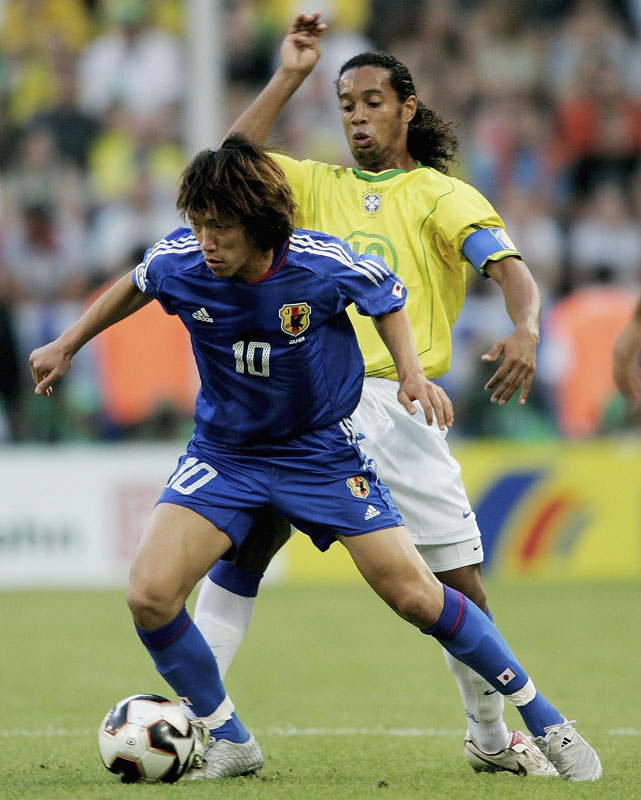 ロナウジーニョとマッチアップする中村俊輔は、このブラジル戦で鮮烈なミドルシュートを決めている。