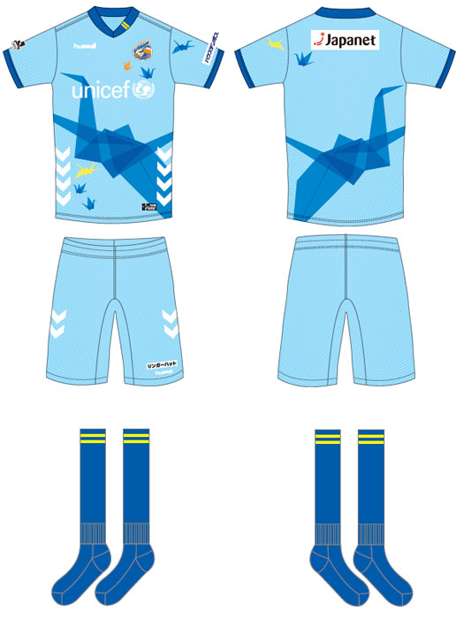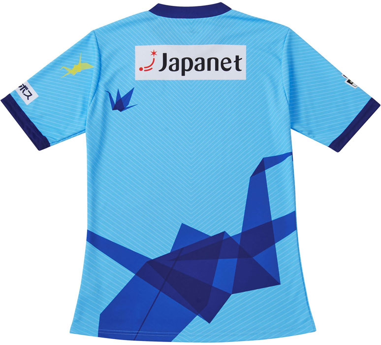 昨年の平和祈念ユニフォームと同じくブルーを基調に、平和の象徴である大きな折り鶴のグラフィックが印象的なデザイン。折り紙の幾何学的な直線のイメージを生かしてスピード感を表現している。