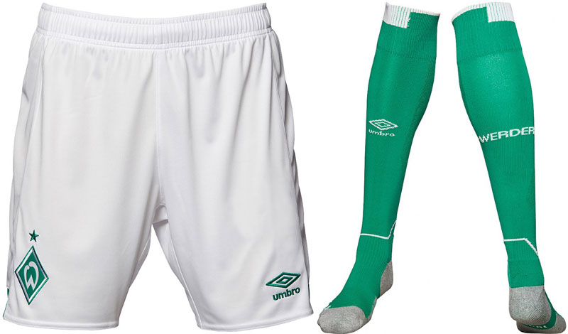 パンツはホワイト、ソックスはグリーンをそれぞれ基調。ソックスの前面にはメーカーロゴ、背面にはチーム名「WERDER」が入る。