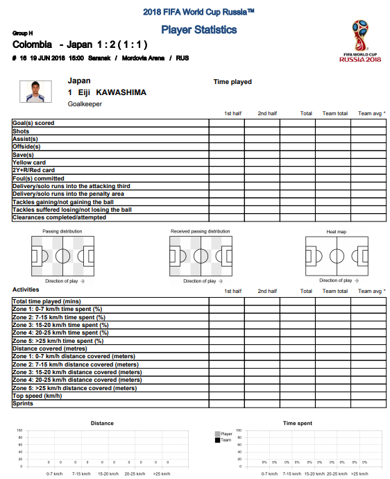 これは、コロンビアとの第1戦での日本側の「Player Statistics」。本来なら各種データが書き込まれているはずなのだが、この試合に限って日本側だけが“空っぽ”に…。