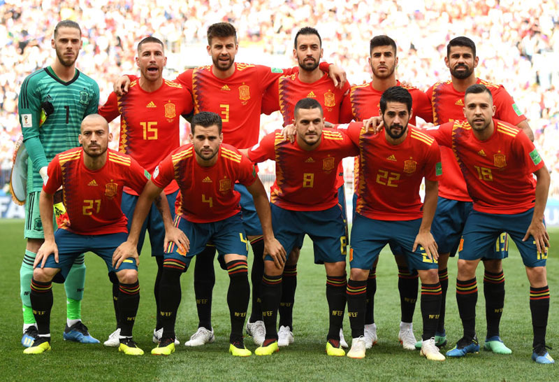 スペイン代表はホームキットで、上から「赤-青-黒」。フィールドプレーヤーはグループステージ第3節に続き同じ組合せ。GKキットは全試合で緑を着用した。