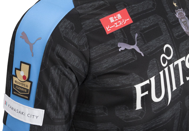 右袖にはリーグチャンピオンパッチと「KAWASAKI CITY」パッチを装着。右胸には玉虫色に変化するカラーシフトのPumaキャットロゴをプリント。